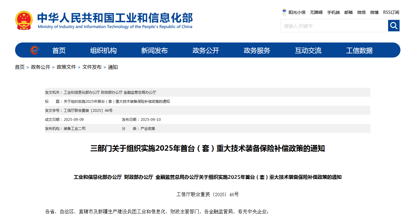 工业和信息化部办公厅 财政部办公厅 金融监管总局办公厅关于组织实施2025年首台(套)重大技术装备保险补偿政策的通知工信厅联合重装〔2025〕46号各省、自治区、直辖市及新疆生产建设兵团工业和信息化、财政主管部门,各金融监管局,有关中央企业
