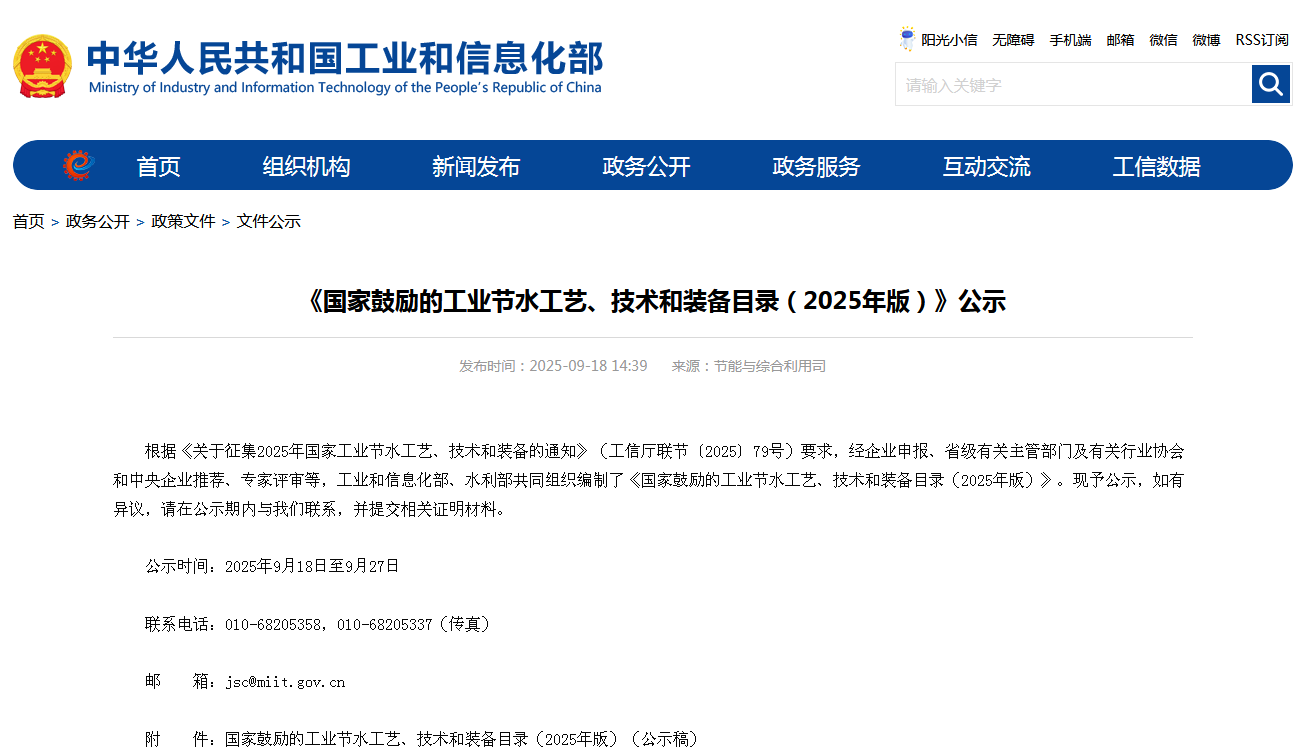 《国家鼓励的工业节水工艺、技术和装备目录(2025年版)》公示根据《关于征集2025年国家工业节水工艺、技术和装备的通知》(工信厅联节〔2025〕79号)要求,经企业申报、省级有关主管部门及有关行业协会和中央企业推荐、专家评审等,工业和信息