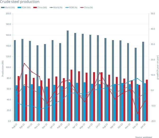 【数据发布】2024年1月全球粗钢产量1.481亿吨,同比下降1.6%