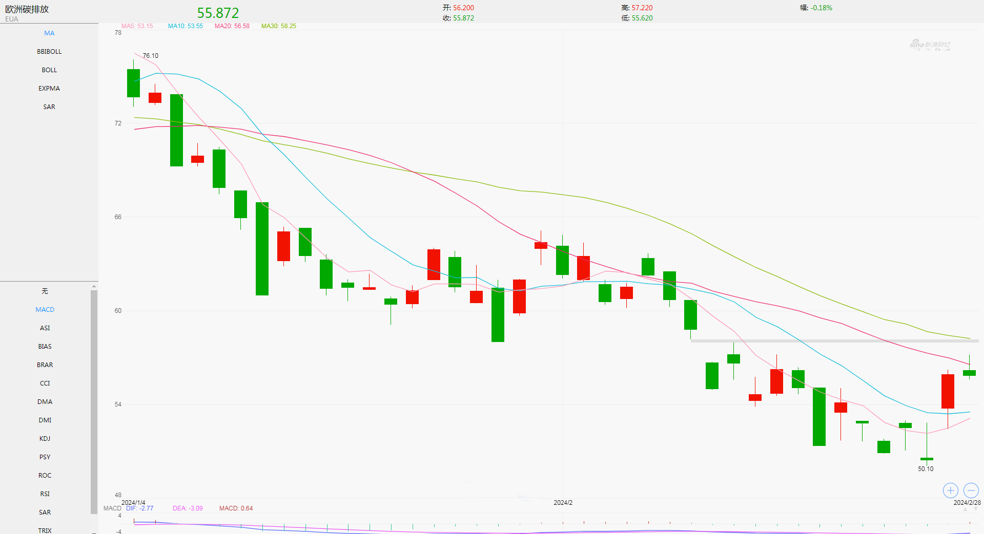 欧盟碳价持续大跌,已至55欧元/吨以下,为自2021年10月以来最低水平,2月27日,欧盟碳价跌至50元左右。2023年欧盟碳价格先强后弱,2月,欧盟碳价格上涨至100.23欧元/吨二氧化碳当量的历史新高,主要原因在于2022年12月欧盟通