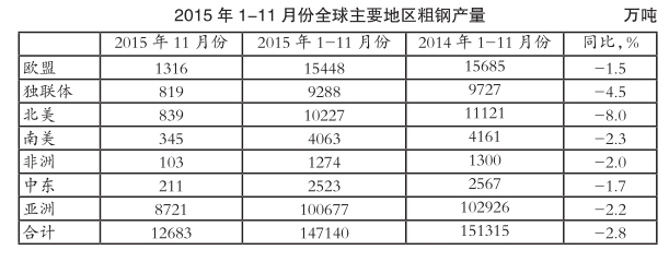 国际钢铁协会12月21日发布的最新统计数据显示,2015年11月份全球66个主要产钢国家和地区粗钢产量为1.268亿吨,同比下滑4.1%,创今年以来月度最大降幅。分地区来看,除大洋洲保持增长外,全球其他地区粗钢产量同比均出现下滑,其中北美、欧盟、非洲和中东降幅相对较大。