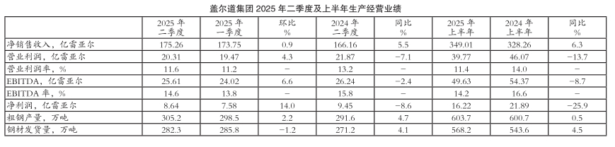 2025年二季度,受钢材发货量环比减少、同比增长,巴西雷亚尔兑美元汇率升值,巴西和阿根廷国内市场钢材销售均价下跌以及美国市场钢材价格上涨等因素共同影响,盖尔道集团净销售收入由一季度的173.75亿雷亚尔环比微增0.9%至175.26亿雷亚尔,与2024年二季度的166.16亿雷亚尔相比也小幅增加5.5%。2025年二季度,受铁矿石成本增加、废钢成本下降、检修维护成本增长、产品销售成本微增以及钢材产量环比增长导致的均摊到吨钢上的固定成本下降等因素共同影响,盖尔道集团2025年二季度营业利润由一季度的19.47亿雷亚尔环比小幅提高4.3%至20.31亿雷亚尔,与2024年二季度的21.87亿雷亚尔相比则减少7.1%;营业利润率由一季度的11.2%环比小幅提高0.4个百分点至11.6%,但远低于2024年二季度的13.2%。2025年二季度,受盖尔道集团旗下北美部门息税、折旧及摊销前利润(EBITDA)增长以及巴西部门和南美部门EBITDA均环比下降等因素共同影响,盖尔道集团EBITDA由一季度的24.02亿雷亚尔环比增加6.6%至25.61亿雷亚尔,与2024年二季度的26.24亿雷亚尔相比则小幅回落2.4%;EBITDA率由一季度的13.8%环比小幅提高0.8个百分点至14.6%,但仍低于2024年二季度的15.8%。2025年二季度,巴西雷亚尔兑美元汇率环比升值,这导致盖尔道集团以美元计价的债务换算成雷亚尔之后相应减少,相关财务费用也相应下降。受上述因素共同影响,盖尔道集团2025年二季度净利润由一季度的7.58亿雷亚尔大幅增长14.0%至8.64亿雷亚尔,与2024年二季度的9.45亿雷亚尔相比则下滑8.6%。截至2025年6月30日,盖尔道集团净债务总额为91.16亿雷亚尔,环比和同比分别大幅增长19.4%和53.4%,杠杆比率由一季度末的0.69提高至0.85。