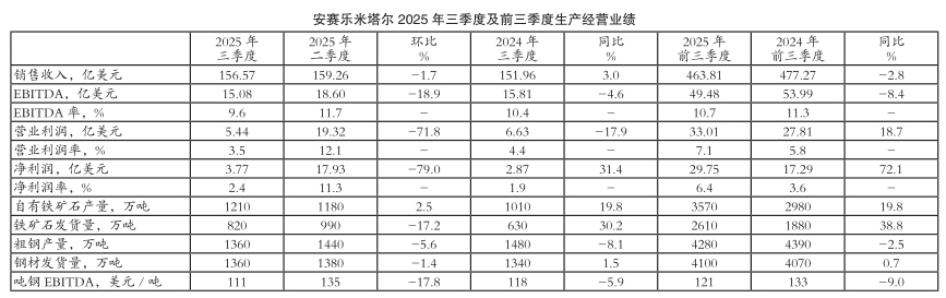 2025年三季度,安赛乐米塔尔公司矿业部门自有铁矿石产量环比增长2.5%,铁矿石发货量环比大幅减少17.2%;同期,国际市场铁矿石价格环比小幅上涨4.5%。受上述因素共同影响,其矿业部门销售收入由二季度的8.57亿美元环比大幅减少14.6%至7.32亿美元,与2024年三季度的5.89亿美元相比则显著增长24.3%;营业利润由二季度的1.96亿美元环比显著缩水27.6%至1.42亿美元,与2024年三季度的1.28亿美元相比则大幅增长10.9%;EBITDA由二季度的2.62亿美元环比显著下滑20.2%至2.09亿美元,与2024年三季度的1.93亿美元相比则提高8.3%。 (植恒毅)