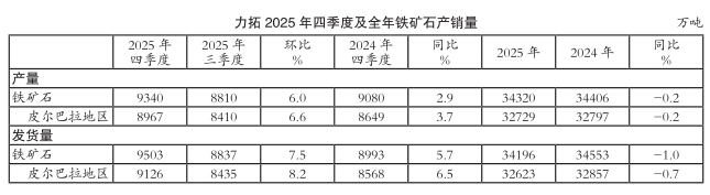 澳大利亚矿业巨头力拓集团于近期公布的2025年四季度产销量报告显示,受益于天气条件有利于开采以及矿山开采效率提升,力拓四季度铁矿石产量实现同环比增长;受益于铁矿石产量同环比双增以及铁路和港口基础设施运行效率提升,力拓铁矿石发货量也实现同环比提高。