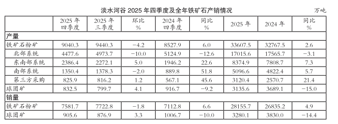 巴西淡水河谷公司近期公布2025年四季度产销量报告。该公司在报告中表示,由于旗下北部系统和南部系统铁矿石粉矿产量环比下降,抵消了东南部系统铁矿石粉矿产量环比增长,淡水河谷2025年四季度铁矿石粉矿产量环比小幅下滑,粉矿销量也随之小幅回落;同期,球团矿产量和销量则实现环比增长。由于二季度和三季度铁矿石粉矿产销量增长抵消了一季度和四季度产销量下滑带来的负面影响,淡水河谷公司2025年铁矿石粉矿产销量实现同比小幅增长,因此该公司小幅上调2026年铁矿石粉矿产量目标。