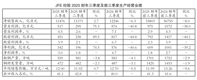 受钢材发货量同比小幅减少、钢材平均销售价格同比下跌以及钢材出口收入占比微降等因素共同影响,JFE控股2025财年前三季度净销售收入由2024财年前三季度的3.68万亿日元同比减少8.0%至3.38万亿日元;营业利润由2024财年前三季度的1572亿日元同比显著下滑38.0%至975亿日元;营业利润率由2024财年前三季度的4.3%同比显著回落1.4个百分点至2.9%;税前利润由2024财年前三季度的1417亿日元同比显著缩水44.1%至792亿日元;税前利润率由2024财年前三季度的3.9%同比显著下滑1.6个百分点至2.3%;净利润由2024财年前三季度的1001亿日元同比显著下降39.2%至609亿日元;净利润率由2024财年前三季度的2.7%同比显著回落0.9个百分点至1.8%。