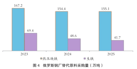与此同时,受钢产量下滑影响,钢厂对替代原料(热压块铁(HBI)和商品生铁)的采购量也有所减少,见图4。不过,2025年NLMK、车里雅宾斯克钢铁公司(ChMK)、普罗姆斯奥特-卡卢加(Promsort-Kaluga)及车里雅宾斯克钢铁公司(TMK)的乌拉尔资产,热压块铁采购量较2024年增加20%-50%。