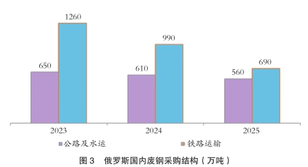 相关数据显示,2025年,俄罗斯粗钢产量同比下降5%至6720万吨(见图2);而以废钢为主要原料的电炉钢产量降幅更为显著,达9%,仅为2240万吨。其中,马格尼托哥尔斯克钢铁公司(MMK)的钢产量跌幅最大(达47%),俄罗斯管材冶金公司(TMK)旗下各工厂产量降幅则在12%-42%之间(具体因厂区而异)。受建筑业危机影响,长材及方坯生产企业面临销售困境,同时半成品出口市场竞争加剧,导致其经营压力进一步增加。2025年,俄罗斯废钢表观消费量同比下降20%至1250万吨(见图3)。钢厂的原料采购结构也发生了明显变化:铁路运费上涨、车厢供应短缺,而公路运输运力过剩(运费较2024年下降约10%),在此背景下,钢厂纷纷转向公路采购。据统计,2025年公路运输占比升至45%,而2024年和2023年这一比例分别为38%和34%。此前完全依赖铁路采购的普罗姆斯奥特-卡卢加(Promsort-Kaluga)、普罗姆斯奥特-乌拉尔(Promsort-Ural)及新利佩茨克钢铁公司(NLMK),2025年也有大量废钢通过公路运输交付。
