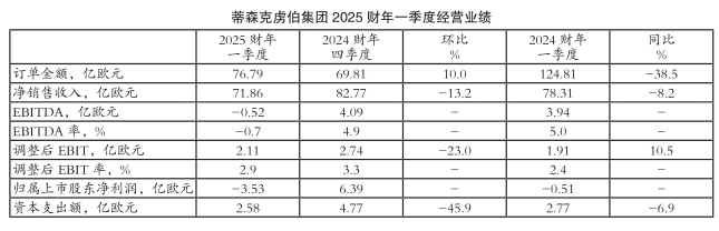 受上述因素共同影响,2025财年一季度(2025年四季度)蒂森克虏伯集团订单金额由2024财年四季度的69.81亿欧元环比大幅增长10.0%至76.79亿欧元,与2024财年一季度的订单金额(124.81亿欧元)相比则显著缩水38.5%;净销售收入由2024财年四季度的82.77亿欧元环比大幅减少13.2%至71.86亿欧元,与2024财年一季度的净销售收入(78.31亿欧元)相比也下降8.2%;息税、折旧及摊销前利润(EBITDA)再度陷入亏损,由2024财年四季度的盈利4.09亿欧元转为亏损0.52亿欧元,2024财年一季度的EBITDA为盈利3.94亿欧元;EBITDA率由2024财年四季度的4.9%环比显著回落至-0.7%,且远低于2024财年一季度的5.0%;调整后EBIT由2024财年四季度的2.74亿欧元环比显著下滑23.0%至2.11亿欧元,与2024财年一季度的调整后EBIT(1.91亿欧元)相比则大幅增长10.5%;调整后EBIT率由2024财年四季度的3.3%环比大幅回落至2.9%,但仍高于2024财年一季度的2.4%;归属上市公司股东净利润也陷入亏损,由2024财年四季度的盈利6.39亿欧元转为亏损3.53亿欧元,2024财年一季度归属上市公司股东净利润为亏损0.51亿欧元。