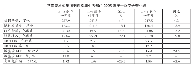 2025财年一季度钢铁欧洲业务部门经营业绩