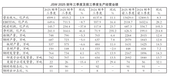 受钢材发货量同环比双双增长,钢材国内销量同环比增加,以及印度国内钢材平均销售价格环比下跌等因素共同影响,JSW公司2025财年三季度营业收入由2025财年二季度的4515.2亿卢比环比小幅增加1.9%至4599.1亿卢比,与2024财年三季度的4137.8亿卢比相比也大幅增长11.1%;受印度国内焦煤价格上涨、动力煤价格下降、电力成本环比回落、卢比贬值引发汇兑损失增加,以及利息成本环比下降等因素共同影响,息税、折旧及摊销前利润(EBITDA)由2025财年二季度的711.5亿卢比环比减少8.7%至649.6亿卢比,与2024财年三季度的557.9亿卢比相比则大幅提高16.4%;税前利润由2025财年二季度的234.4亿卢比环比显著缩水37.8%至145.7亿卢比,与2024财年三季度的117.8亿卢比相比则显著增长23.7%;净利润由2025财年二季度的164.6亿卢比环比显著提升46.4%至241.0亿卢比,与2024财年三季度的71.9亿卢比相比也激增235.2%。