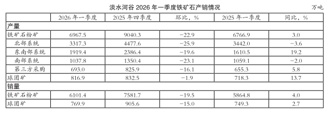 巴西淡水河谷公司近期公布2026年一季度产销量报告。该公司在报告中表示,受益于旗下东南部系统铁矿石粉矿产量同比增长,抵消了北部系统和南部系统铁矿石粉矿产量同比下降,淡水河谷一季度铁矿石粉矿产量同比小幅增加,粉矿销量也随之小幅提升;同期,球团矿产量和销量也实现同比增长。鉴于2026年一季度铁矿石粉矿和球团矿产量均实现同比小幅增长,淡水河谷公司维持2026年铁矿石粉矿和球团矿产量目标不变。