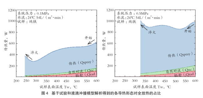 图4展示了通过试验以及基于液滴碰撞模型的分析所得的、各传热形式在试样总散热量中所占的比例。纵轴为传热量,横轴为被冷却金属试样的表面温度。由图4可知,喷射水带来的传热占总传热的80%以上,正如预期的那样,试样在较宽的温度范围内主要通过水传热实现冷却。