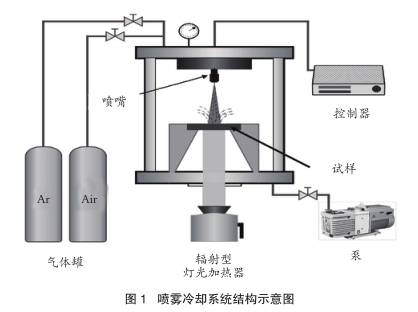 传统喷雾冷却试验是在大气气氛下进行的,试验中难以排除氧化膜生成、长大对喷雾冷却性的影响。本试验在容器内设置了喷雾冷却装置,可进行各种气氛气体(本试验使用N2气和Ar气)和不同压力(0.1MPa-0.5MPa)条件下的喷雾冷却试验。此外,为了对试样从加热到冷却的气氛进行连续控制,在容器外设置辐射型灯光加热器,图1是环境控制型喷雾冷却试验装置的示意图。