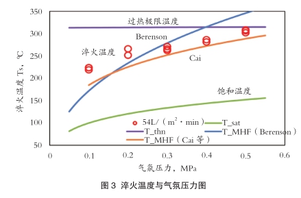 图3是本试验得到的淬火温度与气氛压力的关系。淬火温度是根据喷射冷却中体积流量密度分别为54L/(m2·min)和 79L/(m2·min) 时的数据估算得出的。作为参考,图中还标注了水的热力学过热极限温度及饱和温度的推算值。