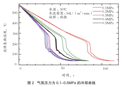 图2为试样在喷射冷却过程中,不同气氛压力下的冷却曲线。在所有压力条件下,均观测到膜沸腾区域和核沸腾区域,冷却速度的显著差异主要出现在膜沸腾区域。