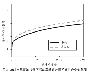 图2展示了晶体塑性有限元分析结果,在变形初期,单轴拉伸与等双轴拉伸条件下的激活滑移系数量基本一致,但随着变形推进,等双轴拉伸下活动的滑移系数量显著增多。通常认为,活动滑移系的数量越多,越容易产生潜在硬化。由于潜在硬化在整体硬化中常占主导,等双轴拉伸因而表现出比单轴拉伸更显著的加工硬化现象。