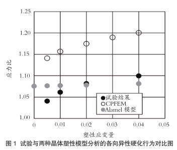 图1展示了单轴拉伸(x轴方向)与等双轴应力条件下的应力比,以及各向同性试验值。CPFEM模型应力值较高但再现了应力升高趋势,Alamel模型也有效再现了各向异性硬化行为。