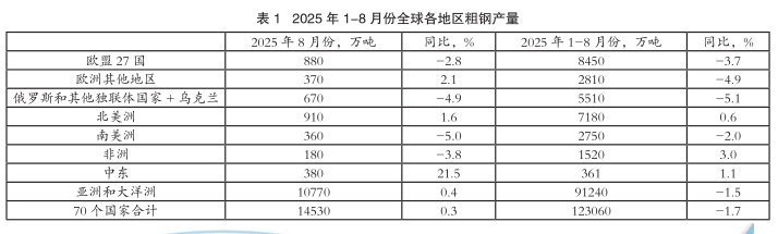 世界钢协9月24日公布的统计数据显示,2025年8月份全球70个纳入该机构统计的国家和地区粗钢产量合计为1.453亿吨,同比小幅增长0.3%。