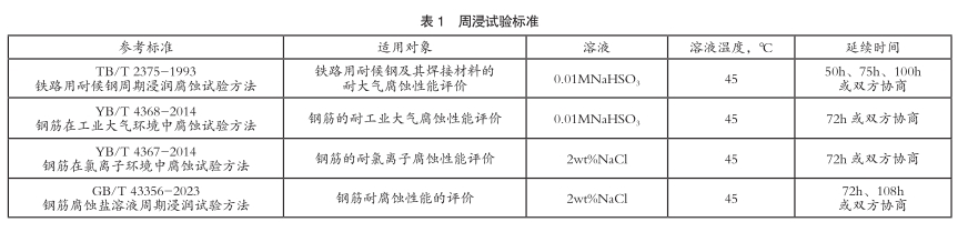 干湿周浸循环试验一般在周期浸润箱中进行多次循环操作,每个循环主要包括浸润和干燥两个阶段。周浸试验腐蚀速率大、试验周期短,可模拟干湿交替的腐蚀过程。表1为螺纹钢周期浸润试验的相关国家标准。值得注意的是,在不同标准的试验方法中,样品浸润的溶液种类、浓度、温度、干燥时周浸箱的大气湿度、每个循环中浸润和干燥的时间、以及周浸试验的延续时间均有所不同。