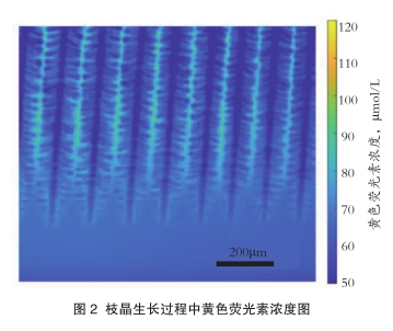 图2展示了采用丁二腈-1wt%水-65μmol/L荧光黄溶液,在温度梯度7600K/m、凝固速度100μm/s条件下进行枝晶生长试验所获得的的荧光黄浓度分布图。结果显示,与远离枝晶的液相相比,枝晶间的液相区域中荧光黄浓度明显更高。一次枝晶臂间的荧光黄浓度分布曲线与Park等人的定性评估结果一致,呈平缓的S型曲线变化。