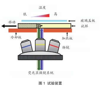 图1是试验装置的示意图。在可施加温度梯度的加热-冷却装置上,放置封装丁二腈-水-黄色荧光素溶液(溶液厚度150μm)的凝固观察用的玻璃容器盖板。通过驱动电机将该玻璃板以100μm/s的恒定速度向低温侧移动,促进枝晶生长,并对这一过程进行荧光成像。借助预先绘制的校准曲线,由荧光强度定量评估荧光黄浓度,进而研究微观偏析行为。观察夹杂物析出行为时,使用经调整可使荧光黄在凝固过程中达到过饱和状态的溶液进行凝固试验,并在特定温度下保温。通过荧光成像观察过饱和荧光黄的析出过程,分析其析出行为。