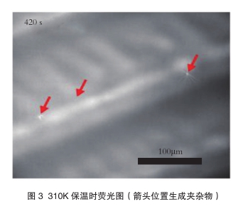图3展示了将丁二腈-1wt%水-400μmol/L黄色荧光素的试验模型溶液冷却到310K保温时的荧光图像。箭头所示位置可观察到析出物,且随着时间推移,析出物数量逐渐增多。在不同过饱和条件下的试验结果表明,随着过饱和度的增大,夹杂物的析出数量显著增加。将数密度随时间变化曲线的斜率视为夹杂物的形核频率,分析其与温度及过饱和度的相关性,结果发现该形核频率可通过经典形核理论进行合理解释。