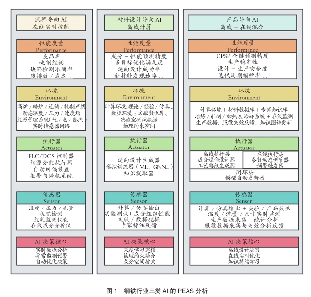 人工智能在钢铁行业的应用正经历从单一场景优化向系统化创新的深刻转变。董瀚教授及其带领的高性能钢铁材料团队,基于钢铁行业全生命周期的工艺复杂性与性能进阶需求,结合人工智能技术的发展趋势与落地状况,提出了“产品导向AI”这一新范式。该理念将设计与制造紧密融合,打通从材料成分到工艺实现的智能闭环。在此基础上,进一步系统性分析可将现有AI应用划分为流程导向AI、材料设计导向AI与产品导向AI三大类,分别对应于生产优化、材料研发与产品全生命周期协同的不同侧重点,揭示出它们在时间结构、数据架构与反馈机制上的本质差异(图1)。