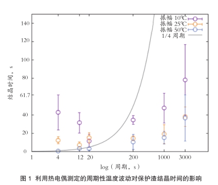 本研究表明,连铸过程中保护渣所受的周期性温度波动并非次要因素,而是显著影响其凝固行为的关键动态条件。通过采用热电偶法对模拟保护渣(67CaSiO3-33Li2SiO3)进行试验,发现在振幅10-50℃、周期4-3000s的温度波动下,结晶开始时间较等温条件(1050℃下61.7s)普遍缩短,证实了周期热扰动对结晶具有明确的促进作用。