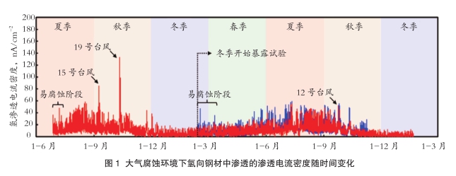 图1展示了大气腐蚀环境下钢材氢渗透电流密度随时间的变化情况。对于夏季开始暴露试验的试样,在试验初期以及秋季台风临近期间,氢渗透明显增强。这可能是由于钢材表面在腐蚀初期较为活跃,且台风临近时降雨量大、大气盐分多,促进了腐蚀反应,从而加剧了氢的渗透。此后,从冬季到春季,氢渗透电流密度维持在相对较低的水平。这可能是因为该时期温度和湿度较低,不利于腐蚀发生;同时,钢材表面已形成锈层,对腐蚀起到了一定的抑制作用。
