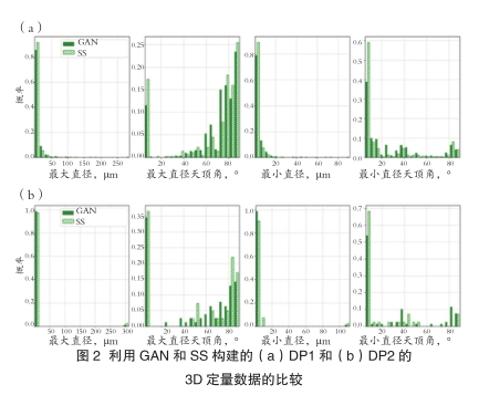 对于DP1和DP2,GAN均生成了与SS高度相似的三维组织(图1(a)、(b))。此外,从SS-3D和GAN-3D中提取了表征平均组织的特征量,如马氏体的体积分数和粒子数量,并进行比较。结果显示,在DP1中,SS-3D与GAN-3D中的马氏体体积分数分别为13.7%和10.4%,粒子数量分别为609个和635个;在DP2中,SS-3D与GAN-3D中的马氏体体积分数分别为39.5%和42.1%,粒子数量分别为84个和147个,两者较为一致。进一步提取了表征单个粒子三维组织的特征量,如最大/最小直径、最大/最小直径的天顶角,比较发现其分布高度吻合(图2(a)、(b))。因此,研究结果表明,GAN不仅能够生成等向性三维组织,对于具有异向性的三维组织也能以较高精度进行生成。