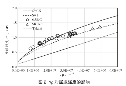 在强度与位错密度的关系方面,研究将试验数据与Takaki提出的位错强化理论模型进行了对比(图2)。结果表明,尽管螺旋位错分量的比例存在一定波动,但该理论模型能很好地描述屈服强度随位错密度平方根变化的非线性特征。特别是对于经过高温回火并产生二次硬化效应的材料(如SKD61钢),其强度表现与理论预测值高度吻合。这证实了在高温回火状态下,位错密度仍是决定板条马氏体强度的核心因素,且可以通过控制块径来进行有效调控。