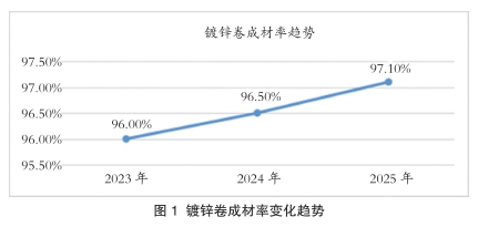通过上述优化措施,镀锌卷成材率不断提升。随着订单品种和规格的变化,各项控制措施不断完善,镀锌线成材率由2022年的96.8%提升到2025年上半年97.35%,其中2025年一季度达到了97.38%的水平(图1)。