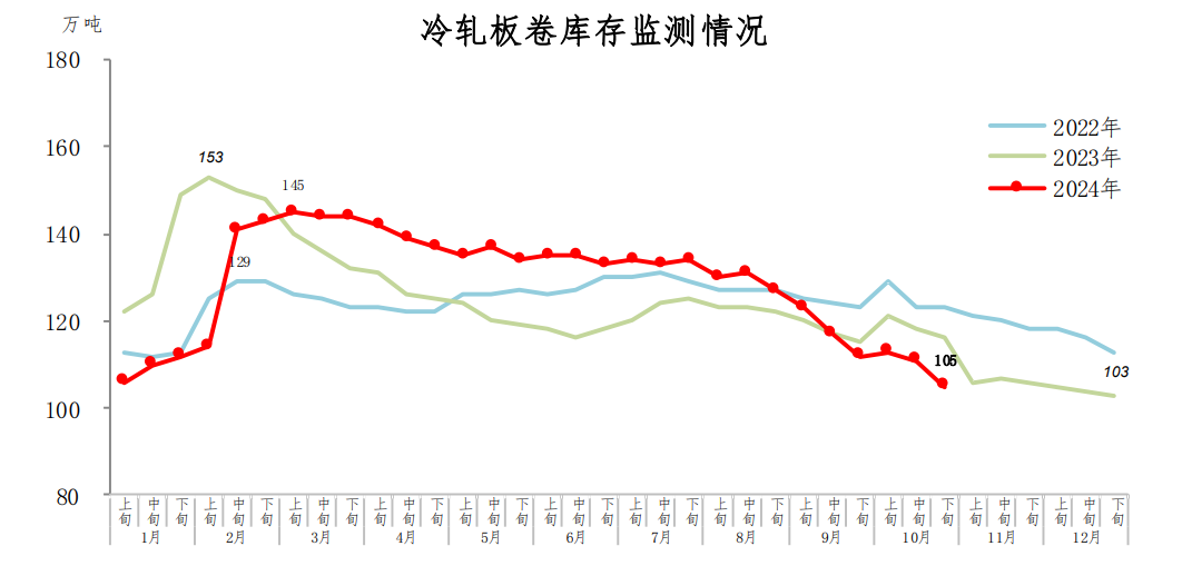 10月下旬,冷轧板卷库存105万吨,环比减少6万吨,下降5.4%,库存降幅扩大;比9月下旬减少7万吨,下降6.3%;比年初增加2万吨,上升1.9%;比上年同期减少11万吨,下降9.5%。