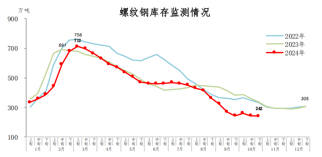 10月下旬,螺纹钢库存242万吨,环比减少2万吨,下降0.8%,库存小幅下降;比9月下旬减少2万吨,下降0.8%;比年初减少63万吨,下降20.7%;比上年同期减少94万吨,下降28.0%。