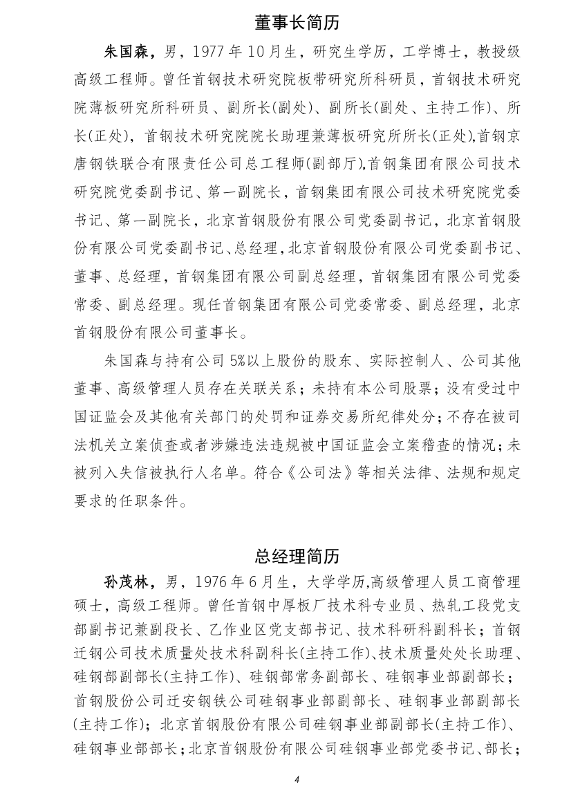 根据《北京首钢股份有限公司章程》规定和工作需要,董事会同意聘任赵鹏、谢天伟、徐海卫为公司副总经理,聘任刘同合为公司总会计师,聘任乔雨菲为公司总法律顾问,任期均为三年。上述人选简历附后。