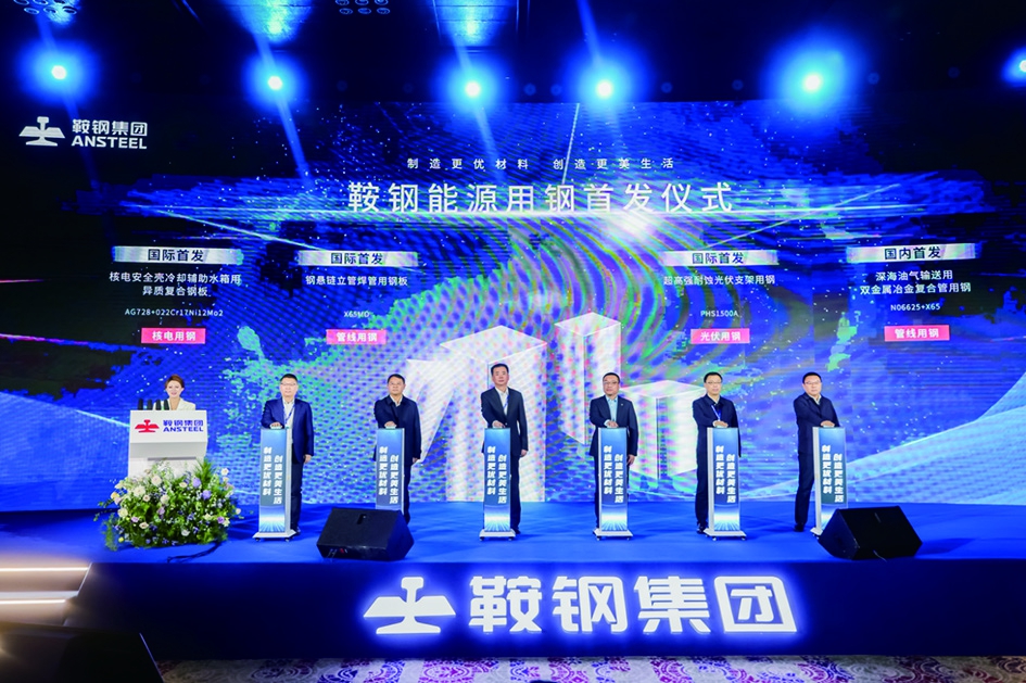 作为此次大会的重磅环节,鞍钢集团全球首发核电安全壳冷却辅助水箱用异质复合钢、钢悬链立管焊管用钢、超高强耐蚀光伏支架用钢等三项产品,国内首发深海油气输送用双金属冶金复合管用钢一项产品。这些高端产品不仅为大国重器提供关键材料支撑,更以可持续的“鞍钢力量”赋能能源产业绿色转型。