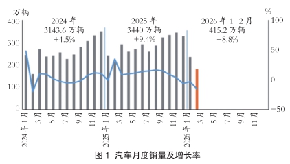 1-2月份,汽车产销累计完成412.2万辆和415.2万辆,同比分别下降9.5%和8.8%。