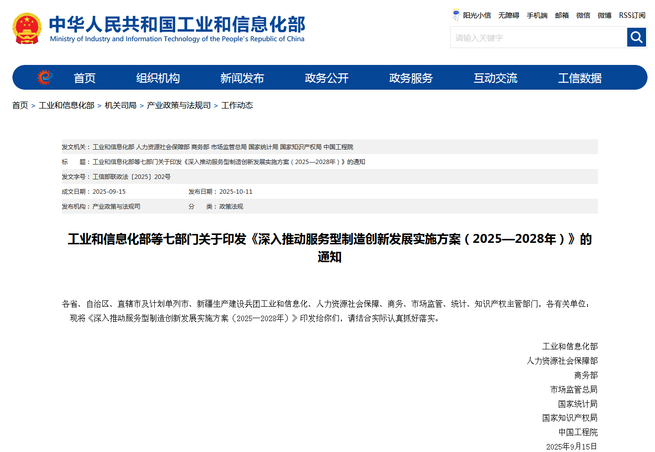 工信部等七部门联合印发《深入推动服务型制造创新发展实施方案(2025—2028年)》
