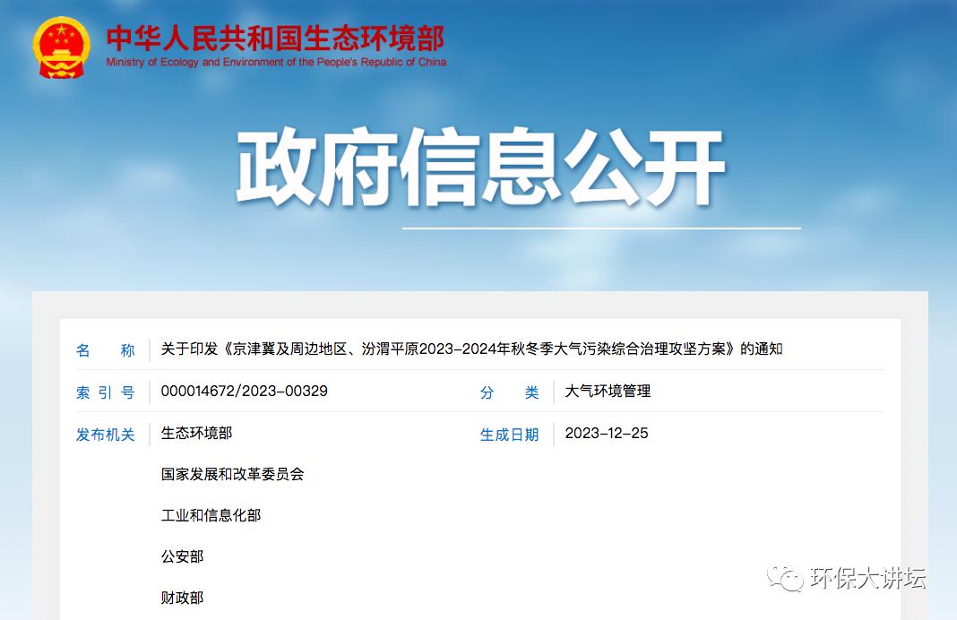 生态环境部:《京津冀及周边地区、汾渭平原2023-2024年秋冬季大气污染综合治理攻坚方案》发布
