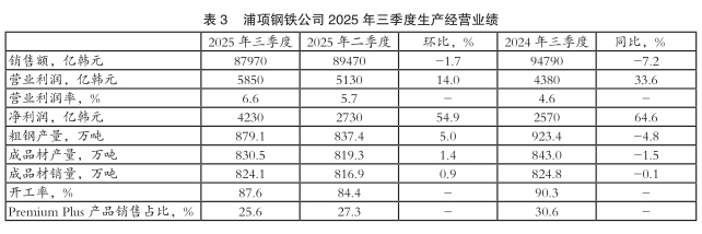 2025年三季度,浦项钢铁公司营业收入为87970亿韩元,营业利润为5850亿韩元,营业利润率升至6.6%,盈利能力正持续增强。碳钢产品的平均销售价格从二季度的93.6万韩元/吨微降至三季度的91.1万韩元/吨;主要原料成本占销售额的比例从二季度的100点(碳钢成本指数化)降至三季度的93点,故而成本负担有所减轻。与此同时,粗钢产量和成品材产量分别较二季度增加41.7万吨和11.2万吨,带动均摊到每吨产品上的固定成本下降,多重因素共同推动了盈利增长。2025年三季度,浦项钢铁公司产能利用率上升3.2个百分点,达到87.6%,尽管产销量小幅增长,但低碳排放钢材、Hyper NO、高附加值特殊钢等“Premium Plus”高收益产品的销售占比降至25.6%。