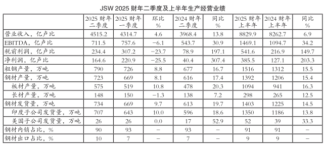 受钢材发货量同比大幅增长、钢材国内销量占比持平以及印度国内市场钢材价格同比下跌等因素共同影响,JSW公司2025财年上半年营业收入由2024财年上半年的8262.7亿卢比同比增长6.9%至8829.9亿卢比;EBITDA由2024财年上半年的1094.7亿卢比同比显著增长34.2%至1469.1亿卢比;税前利润由2024财年上半年的216.9亿卢比同比显著提升149.7%至541.6亿卢比;净利润由2024财年上半年的127.1亿卢比同比激增203.3%至385.5亿卢比。(植恒毅)