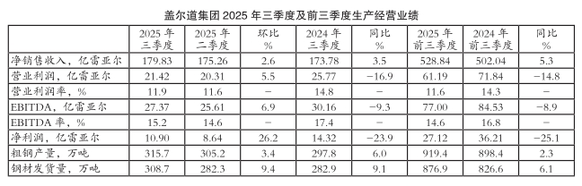 2025年三季度,受钢材发货量同环比增长,巴西雷亚尔兑美元汇率环比升值,巴西和阿根廷国内市场钢材销售均价下跌以及美国市场钢材销售均价小幅上涨等因素共同影响,盖尔道集团净销售收入由二季度的175.26亿雷亚尔环比小幅增加2.6%至179.83亿雷亚尔,与2024年三季度的173.78亿雷亚尔相比也小幅提高3.5%。2025年三季度,受铁矿石成本增加、废钢成本回落、检修维护成本减少、产品销售成本下降以及钢材产量环比增长导致的均摊到吨钢上的固定成本下降等因素共同影响,盖尔道集团营业利润由二季度的20.31亿雷亚尔环比小幅增长5.5%至21.42亿雷亚尔,与2024年三季度的25.77亿雷亚尔相比则大幅下滑16.9%;营业利润率由二季度的11.6%环比小幅提高0.3个百分点至11.9%,但远低于2024年三季度的14.8%。2025年三季度,受盖尔道集团旗下北美部门和南美部门息税、折旧及摊销前利润(EBITDA)均环比增长以及巴西部门EBITDA环比下降等因素共同影响,盖尔道集团EBITDA由二季度的25.61亿雷亚尔环比增加6.9%至27.37亿雷亚尔,与2024年三季度的30.16亿雷亚尔相比则回落9.3%;EBITDA率由二季度的14.6%环比小幅提高0.6个百分点至15.2%,但仍低于2024年三季度的17.4%。2025年三季度,巴西雷亚尔兑美元汇率环比升值,这导致盖尔道集团以美元计价的债务换算成雷亚尔之后相应减少,相关财务费用也相应下降。受上述因素共同影响,盖尔道集团2025年三季度净利润由二季度的8.64亿雷亚尔环比显著增长26.2%至10.90亿雷亚尔,与2024年三季度的14.32亿雷亚尔相比则显著下滑23.9%。截至2025年9月30日,盖尔道集团净债务总额为87.70亿雷亚尔,环比小幅减少3.8%,但同比激增136.9%,杠杆比率由二季度末的0.85下降至0.81。